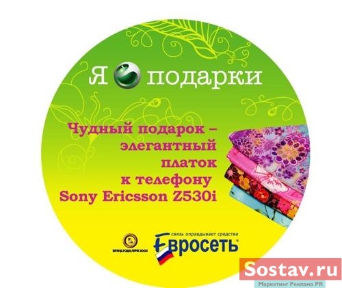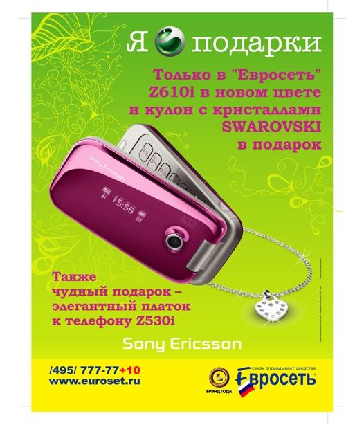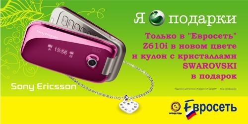 Телефоны Sony Ericsson в ореоле кристаллов SwarovskiКак стало известно Sostav.ru, накануне Дня всех влюбленных Sony Ericsson и Евросеть запустили акцию под названием "Я люблю подарки". Кампания будет длиться месяц: с 8 февраля по 8 марта 2007. Как было заявлено, в период проведения акции покупатель розового телефона Sony Ericsson Z610i получает в подарок кулон с кристаллами Swarovski, а дамский шейный платок обещают тем, кто приобретет Sony Ericsson Z530i. В рамках кампании была запущена реклама на телевидение, в печатных изданиях и outdoor. Акция проводится на всей территории России.