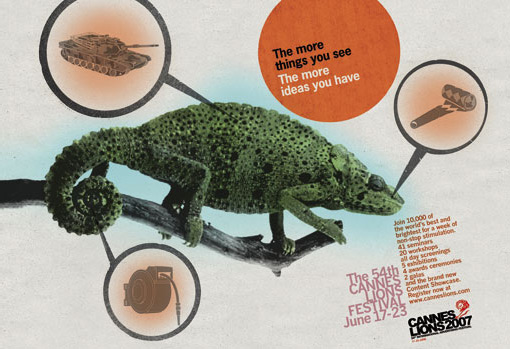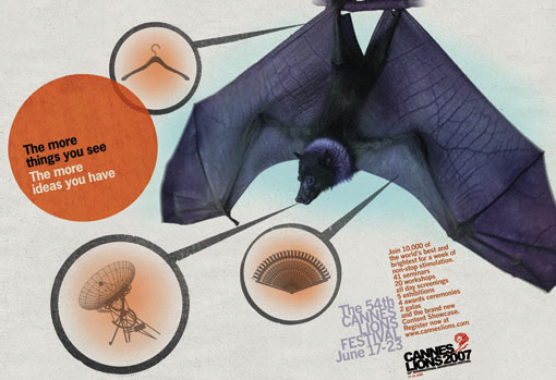 Реклама для Cannes Lions 2007Даже крупнейший фестиваль рекламы нуждается в ней. Именно к такому выводу пришли организаторы Cannes Lions 2007 и начали соответствующую кампанию. Суть этих принтов заключается в том, что у творческого человека даже при виде акулы, летучей мыши, хамелеона или лобстера сразу возникает огромное количество идей. Например, летучая мышь может ассоциироваться у творческой личности с вешалкой, спутниковой тарелкой и веером. Надпись: "Чем больше вещей ты видишь - тем больше идей у тебя возникает" ![]() ![]() ![]() ![]() |