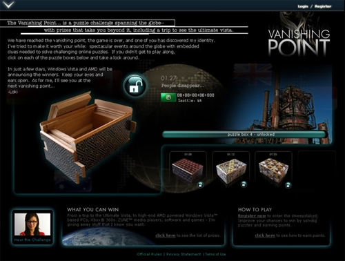 С игрой Vanishing Point корпорация Microsoft захотела большего. Аарон Колдирон и Брайан Марр – маркетологи Microsoft, занимающиеся продвижением Vista, вместе с агентством 42 Entertainment начали подготовку за целый год до начала игры. Глава агентства Вайсман занимался разработкой видеоигр в Microsoft – таких, как знаменитый сериал Mech Assault. Вместе со своим продюсером Сюзан Бондс они собрали команду из числа участников The Beast – первой игры в альтернативной реальности, целью которой ставилось выращивание фанов фильма Стивена Спилберга «Искусственный разум». Для продвижения операционной системы Vista был создан сюжет с героиней – Локки (в исполнении актрисы), якобы сотрудницей корпорации Microsoft в должности ведущего специалиста по паззлам. Команда отправилась на поиски сообщений, оставленных следом от самолетов в небе и попыток получить разрешения на освещение странных посланий на стенах Дворца Изящных Искусств в Сан Франциско и Национальной Галерее в Лондоне.