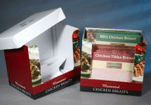 Новая упаковка представляет собой коробку с прорезным окошком на фронтальной панели, внутри которой находится двухъярусная полочка. Таким образом, разные виды мяса располагаются на отдельных ярусах и становятся хорошо видны покупателю.