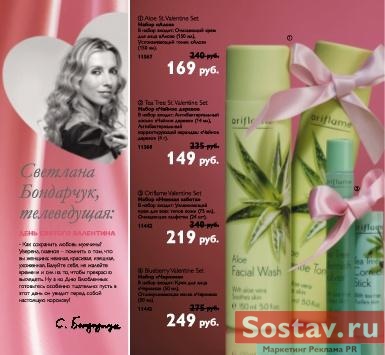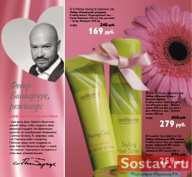 Love story семейного дуэта Бондарчуков в рекламе ОrifalmeВ февральском каталоге Oriflame в ореоле розовых тонов семья Бондарчуков говорит о подарках и любви. День святого Валентина стал поводом для фотоистории, в которой Светлана и Федор демонстрируют свои чувства на страницах, озаглавленных "Две половинки единого целого". При внимательном просмотре каталога оказывается, что Федор Бондарчук рассказывает про день всех влюбленных на развороте, где представлены средства для укладки: гель и лак для волос. Тогда как Светлана представляет кремы. Как выяснил Sostav.ru, такое размещение оказалось случайностью: "Шутки особой не было, в данном случае Федор и Светлана не рекламируют конкретный продукт. Нашей задачей было просто передать настроение февральского месяца как времени взаимных подарков. Наши покупатели, кем бы они ни были, женщины или мужчины, или семейные пары, должны увидеть, что они могут найти в каталоге подарки для своей второй половины", - рассказывает специалист по маркетингу и рекламе компании Oriflame Сергей Антонов. Идея российского каталога с появлением семьи Бондарчуков родилась в Москве в отделе маркетинга компании. По словам Сергея Антонова, для февральской серии выбрали семью Бондарчуков, потому как этот семейный образ вызывает положительные эмоции: "Эта пара подошла к нашему каталогу как нельзя лучше. Во-первых, эта пара на слуху, они постоянно на орбите светской жизни, во-вторых, к ним люди относятся позитивно, они вдвоем видные личности". Эта была разовая рекламная кампания, уверили в Oriflame, продолжения "love story" от Бондарчуков пока не планируется, по крайней мере, в ближайших каталогах их точно не будет: "У нас нет политики брать звезд и делать их лицом компании, у Loreal такая позиция, у Avon есть Сальма Хайек. Мы же не привязываемся к конкретным звездам. Если мы и приглашаем российских селебритис для участия в создании каталога, то только для активизации интереса к конкретным каталогам без привязки к продуктам". Если говорить о создании самих каталогов, то единый макет делается в Швеции в дизайн-центре Oriflame, после чего он расходится по разным точкам мира, где его адаптируют, учитывая специфику конкретной страны. Каждый год выходит около 17 каталогов.