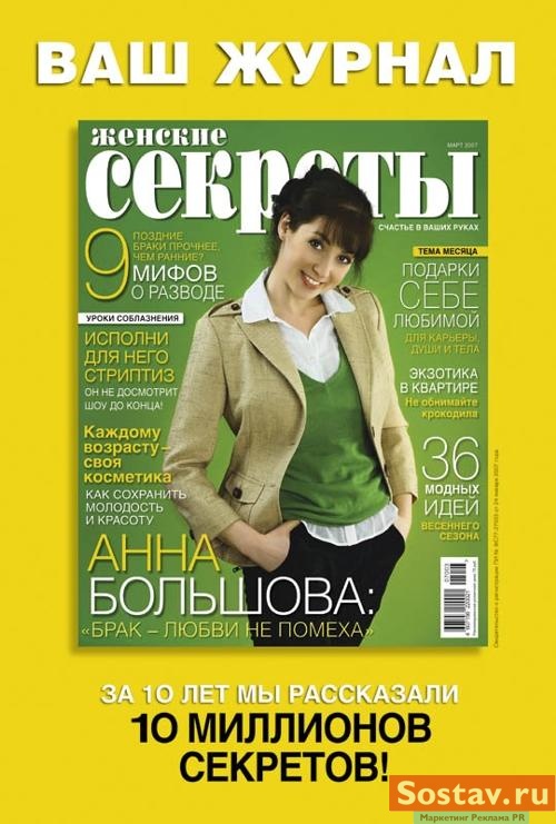 Издательский дом "Креатив Медиа" продвигает свои издания по радиоС середины февраля ИД "Кретив Медиа" (журналы: "Личный бюджет", "Женские секреты" и "Sports Illustrated Swimsuit") начинает рекламную кампанию журнала "Женские секреты", права на издание которого были приобретены "Креатив Медиа" в декабре 2006 года у компании "ООО Компания Вариант Медиа". Рекламная кампания журнала "Женские секреты" включает в себя радиоролики, которые появятся в эфире радиостанций Европа Плюс (Москва), Европа Плюс (СПБ), "Русское радио" (Екатеринбург) и Love Radio (всего: 354 выхода, хронометраж: 20 секунд) наружную рекламу (сити лайты, 4 000) и рекламу метро (720 стикеров, Замоскворецкая и Калужско-Рижская линии). Нынешняя рекламная кампания журнала "Счастье - в Ваших руках" является первым шагом в стратегических планах ИД "Креатив Медиа" по созданию обновленного образа издания. Изменения, которые затронут, в первую очередь, дизайн и формат издания, связаны со стремлением "Креатив Медиа" предлагать рынку качественный, конкурентоспособный продукт, отвечающий потребностям современной российской женщины. "Обновление образа издания не подразумевает коренных, фундаментальных изменений. Мы высоко ценим ту уникальную аудиторию, которая сложилась за 10 лет существования журнала, подчеркивая это и в нашей рекламной кампании: "За 10 лет мы рассказала 10 млн. секретов". Изменения в дизайне, увеличение полосности, появление новых рубрик, и незначительная "невелировка" контента призваны, по нашему мнению, значительно расширить аудиторию издания и повысить его рейтинги", - сообщает Анна Дундукова, директор по маркетингу и общественным связям, ИД "Креатив Медиа". ![]() |