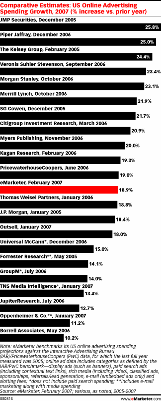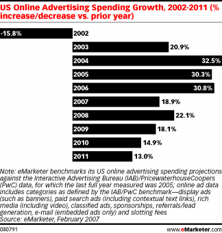 Пик или стабилизация на рынке интернет рекламы? Рынок интернет-рекламы в США в этом году ждет некоторое замедление темпов роста. После того, как сектор в течение трех последних лет показывал рост в 30%, в 2007 году расходы на онлайновую рекламу в США вырастут лишь на 18,9%, - предсказывают авторы доклада «US Online Ad Spending: Peak or Plateau?» «Расходы компаний на онлайновую рекламу в США – пик или стабилизация?»), выпущенного аналитической компанией eMarketer.