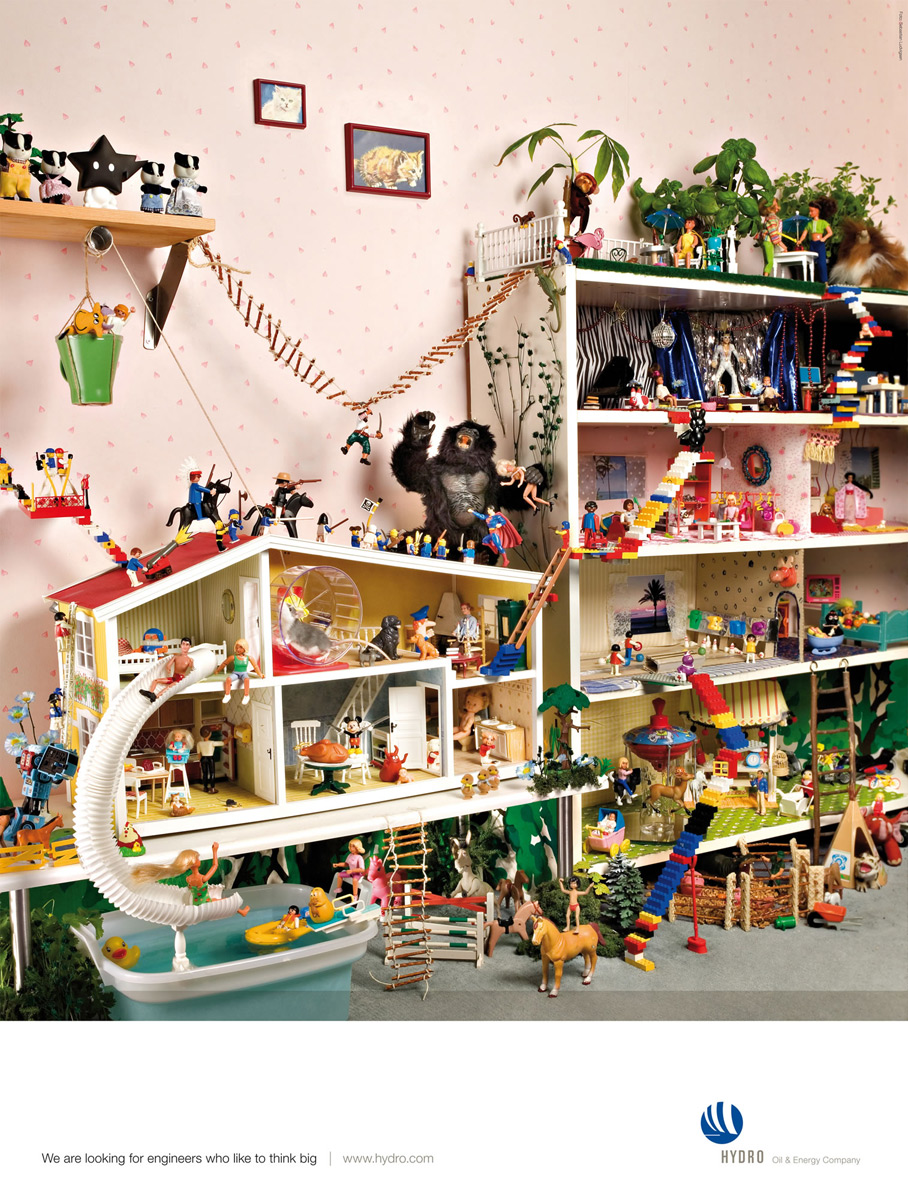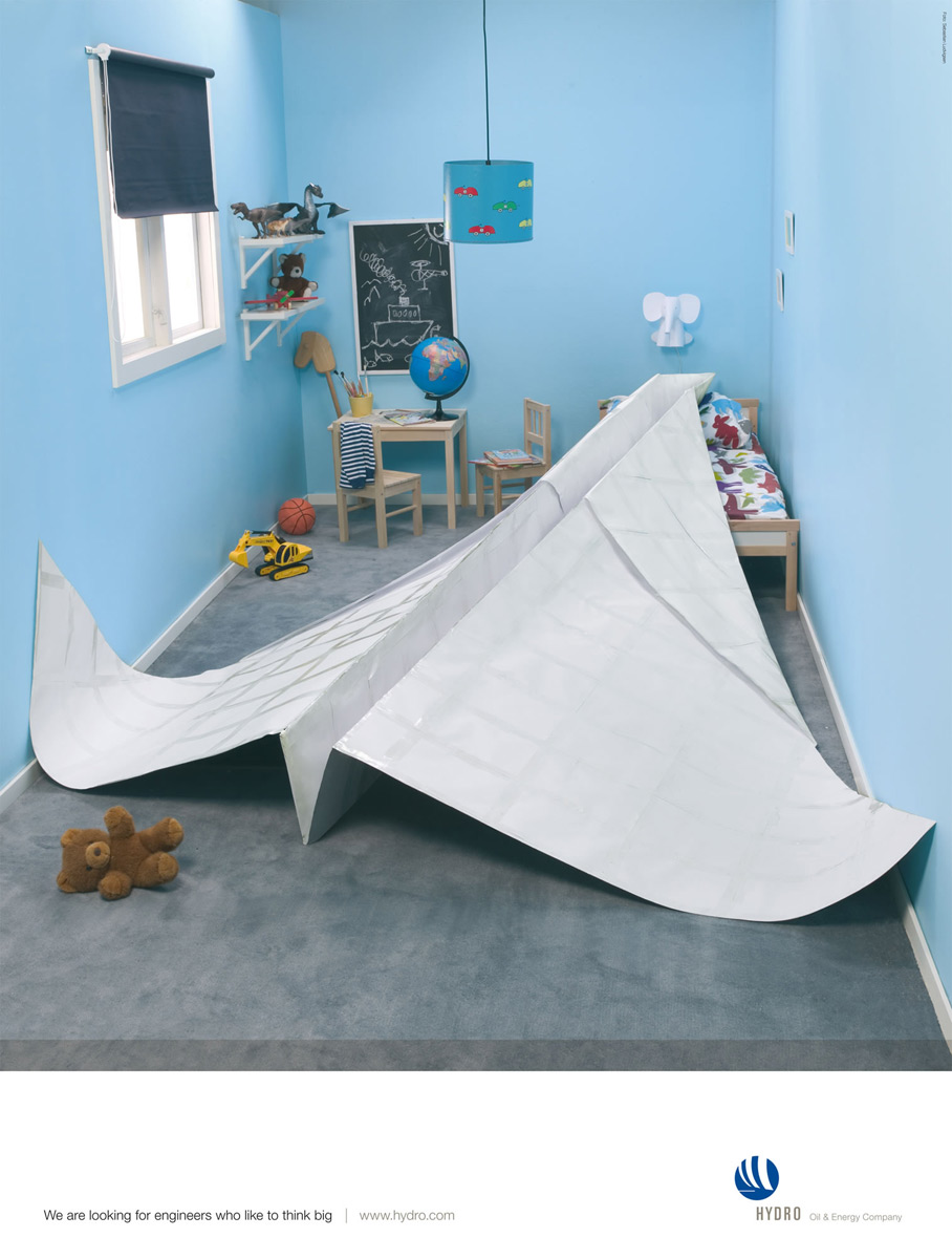 Реклама, созданная агентством DDB Oslo для Hydro Oil & Energy CompanyКомпания Hydro Oil & Energy Company ищет новые таланты. Во всяком случае именно на эту мысль наталкивают принты, созданные агентством DDB Oslo. Hydro нужны такие работники, которые в детстве любили играть с огромными бумажными самолетиками или строили громадные и очень сложные кукольные дома. Надпись: "Мы ищем инженеров, кто любит думать по крупному. Hydro Oil & Energy Company www.hydro.com" Агентство: DDB Oslo, Норвегия Копирайтер: Torbj?rn K Madsen Арт директор: Joachim Bj?rndahl, Jan Erik Nilsen, Rune Markhus Фотограф: Sebastian Ludvigsen |