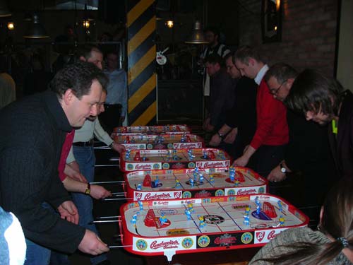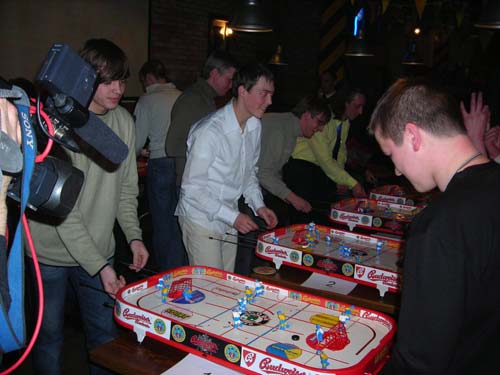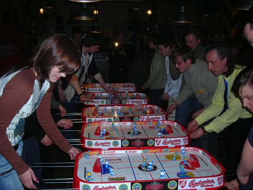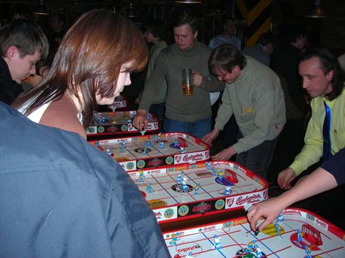 Открытие хоккейного года в МосквеВ минувшую среду в Москве состоялся первый турнир по Пивному Хоккею, организованный Российской Федерацией по настольному хоккею и пивом Budweiser Budvar. Турнир проходил в рамках заседания Общества ценителей и почитателей бравого солдата Швейка, приуроченного ко Дню Защитника Отечества и празднования дня рождения Юлиуса Фучика.[1] Розыгрыш кубка проходил по олимпийской системе. На 10 столах установленных в ресторане «Сварня» более сотни участников вступили в борьбу за право выхода в финал чемпионата и возможность получить главный приз от Budweiser Budvar! По ходу поведения мероприятия Ведущий, бравый солдат Швейк, развлекал публику нескончаемыми шутками. Каждый желающий мог вне конкурса сыграть партию настольного хоккея и выпить кружку отличного пива Budweiser. Все мероприятие проходило в атмосфере настоящего чешского праздника, на котором пиво течет рекой, а смех прерывается только для того, чтобы поднять кружку. Вечер закончился награждением победителей. Быстрых Андрей (Первое место), Морозова Анна (Второе место), Матысяк Алексей (Третье место). Прошедший турнир стал первым этапом чемпионата по настольному хоккею среди посетителей баров и ресторанов Москвы.