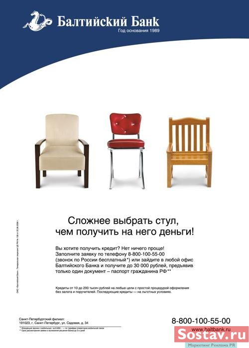 Выведя на рынок свой пакет кредитных предложений для населения, Балтийский Банк отдал заказ на их продвижение группе A.R.M.I. Речь идет о рекламной поддержке трех видов потребительских кредитов - на неотложные нужды ("Универсальный"), на приобретение автомобиля и ипотечного. Стратегия национальной кампании разрабатывалась в A.R.M.I. с учетом высокой конкуренции в этом рыночном сегменте.Реализация проекта началась в последних числах февраля и продлится до конца года, охватив за это время Москву, Санкт-Петербург и еще 24 российских региона. Реклама кредитных услуг Балтийского Банка появится на самых различных носителях. В частности, в прессе - в региональных вкладках газеты "Комсомольская правда", еженедельника "Аргументы и факты" и в местных изданиях. На FM-радиостанциях организована трансляция рекламных аудиороликов. Кампания рассчитана и на пассажиров общественного транспорта. Привлекать их внимание в метрополитенах обеих столиц будут стикеры формата А3. В регионах в продвижении кредитных программ заказчика задействованы щиты размером 6 на 3 м. Все креативные решения для кредита "Универсальный" выполнены в A.R.M.I. Основная мысль, которая в них заложена авторами, - простота и удобство подачи заявки на кредит и получения денег в банке-рекламодателе. ![]() |