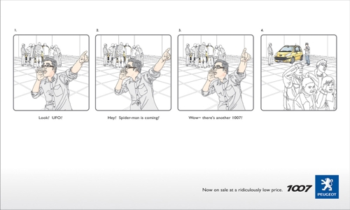 Комиксы агентства EURO RSCG Taiwan для Peugeot 1007Перед вами рекламная кампания, созданная агентством EURO RSCG для Peugeot 1007. Принты сделаны в виде комиксов и изображают комичные ситуации, связанные с автомобилями Peugeot. Комичность связана с ценной, установленной сейчас на этот автомобиль. Надпись: "Теперь в продаже по до смешного низким ценам" Комикс № 1: "Добрый день, могу ли я чем-нибудь помочь? Красную? Сейчас посмотрю… Мммм… Извините, но это черно-белые комиксы. Вам лучше поспешить на смотровую площадку." Комикс № 2: "Смотрите! Летающая тарелка! Эй! Спайдер-мэн идет! Вау… Другой 1007" Агентство: EURO RSCG, Taipei, Taiwan Творческий директор: Chris Yueh Арт директор: Chen Jung Копирайтер: Travis Wu |