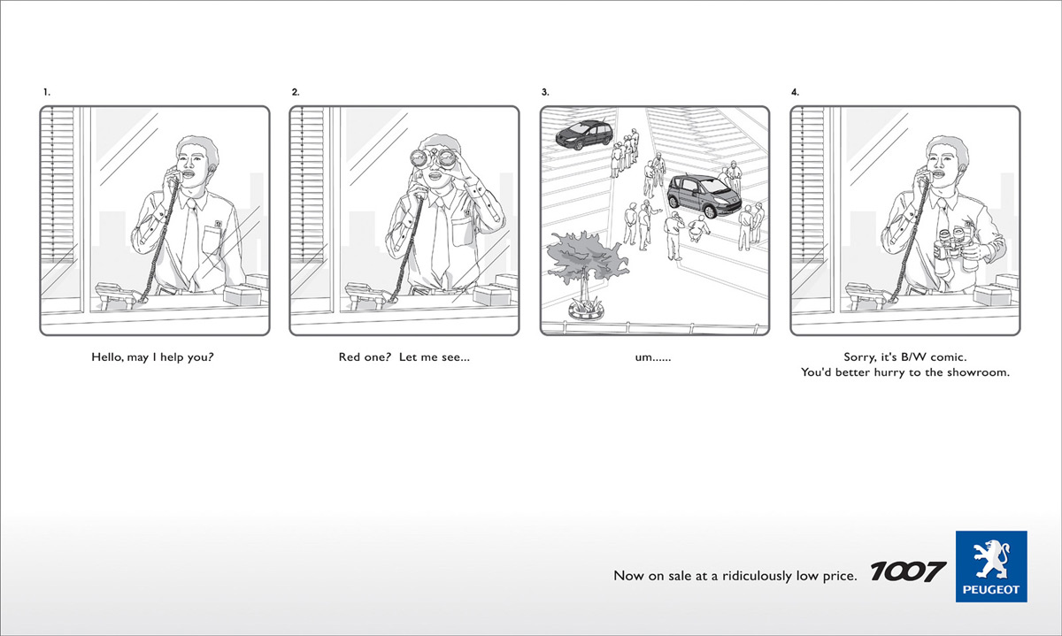 Комиксы агентства EURO RSCG Taiwan для Peugeot 1007Перед вами рекламная кампания, созданная агентством EURO RSCG для Peugeot 1007. Принты сделаны в виде комиксов и изображают комичные ситуации, связанные с автомобилями Peugeot. Комичность связана с ценной, установленной сейчас на этот автомобиль. Надпись: "Теперь в продаже по до смешного низким ценам" Комикс № 1: "Добрый день, могу ли я чем-нибудь помочь? Красную? Сейчас посмотрю… Мммм… Извините, но это черно-белые комиксы. Вам лучше поспешить на смотровую площадку." Комикс № 2: "Смотрите! Летающая тарелка! Эй! Спайдер-мэн идет! Вау… Другой 1007" Агентство: EURO RSCG, Taipei, Taiwan Творческий директор: Chris Yueh Арт директор: Chen Jung Копирайтер: Travis Wu |