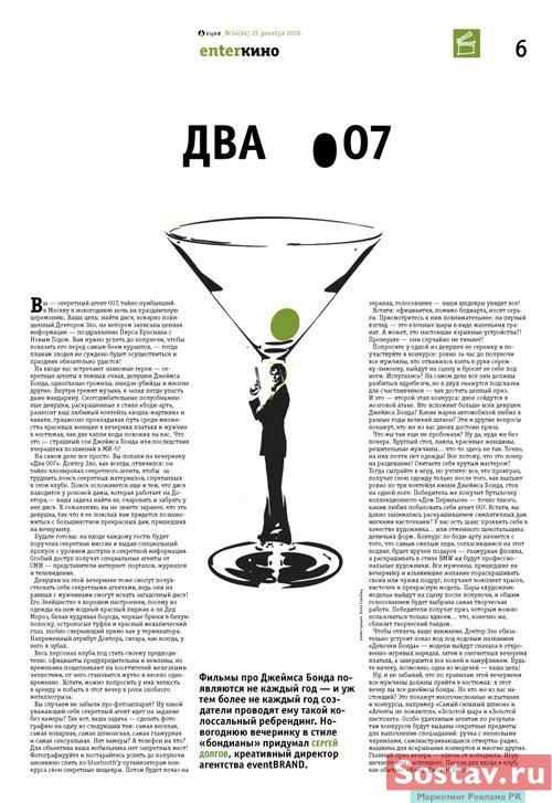 уведомило редакцию 28 февраля. Газета получила три знака отличия (Awards of Excellence) в номинации Feature design pages.До этих наград за всю историю всемирного конкурса газетного дизайна (28 лет) российские газеты получили на этом конкурсе только 4 награды. Две награды из них - за работы 2005 года , одну из которых также получила газета "Акция". Так, газета "Акция" получила наибольшее количество наград во всемирном конкурсе газетного дизайна среди российских газет. Награды получены по итогам 2006 года за обложку октябрьского номера газеты (тема номера - "Научпоп", посвященная молодым ученым и будущему науки в России), за обложку приложения entertainment (тема приложения - "Контркультура") и за полосу приложения entertainment из новогоднего номера (тема материала - новогодняя вечеринка по фильмам о Джеймсе Бонде). Лучшими по дизайну газетами (Best-Designed Newspapers) по итогам 2006 года признаны Aripaev (Эстония), El Economista (Испания), Frankfurter Allgemeine Sonntagszeitung (Германия), Politiken (Дания). Золотые награды получили газеты Excelsior, El Mundo, The New York Times, The New York Times Magazine, The Palm Beach Post, The Virginian-Pilot and Welt am Sonntag. ![]() ![]() ![]() |