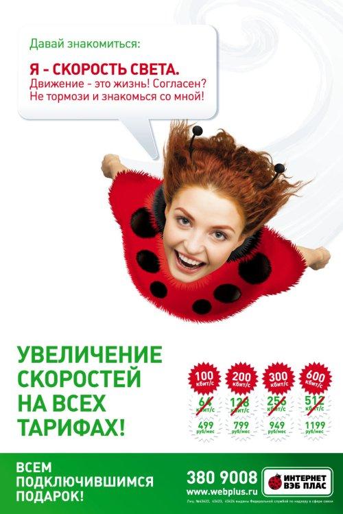 1 марта компания «Вэб Плас» запустила новую рекламную кампанию, персонажами которой стали девушка и юноша, приглашающие познакомиться с возможностями высокоскоростного Интернета. Креативную концепцию кампании разработали специалисты дизайн-бюро «Волга-Волга».