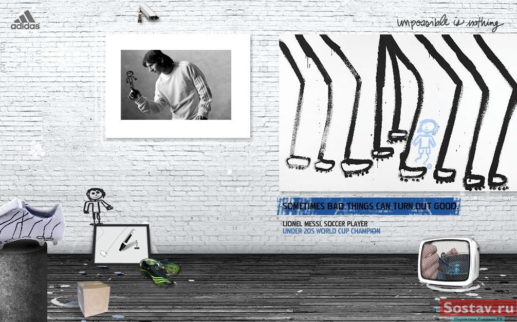 "Невозможное возможно" в новой интерпретации от adidasadidas представила продолжение рекламной кампании, отражающей философию бренда "Невозможное возможно". Новая кампания призывает каждого человека сделать первый шаг к достижению личных невозможных целей. Рассказывая истории реальных людей, которые достигают целей, казавшиеся им самим невозможными, adidas надеется вдохновить каждого задуматься о преодолении собственных трудностей. Более 30 звезд мирового спорта рассказывают свои истории о "Невозможном" с помощью рисунков, сделанных ими от руки. Каждый спортсмен выбрал момент, перевернувший его жизнь, а затем нарисовал и прокомментировал его. Именно эти рисунки и комментарии к ним легли в основу новой рекламной кампании, которая стартовала 6 марта 2007 года по всему миру на телеканалах, в интернете, печатных СМИ и в магазинах adidas. "В новой кампании мы видим великих спортсменов в тот момент, когда они еще не достигли финишной черты, а находятся в поворотной точке своей спортивной карьеры", - объясняет Эрик Лидтке, Старший Вице-Президент по бренд-маркетингу adidas. "Когда вы видите победу, конечный результат, вы не всегда понимаете, как спортсмен смог его достичь и какие трудности ему пришлось преодолеть на своем пути. Проследив пройденный атлетом путь и, что еще важнее, поняв, какие трудности ему пришлось победить, мы можем определить тот момент, который изменил его жизнь. Этот момент не всегда очевиден. Мы считаем, что дав людям возможность заглянуть "за кулисы" жизни этих спортсменов, мы сможем вдохновить их бросить вызов собственному "Невозможному"". Спортсмены были приглашены в художественную студию, где им предложили нарисовать свои истории на бумаге от руки с помощью различных изобразительных средств. Собранный материал войдет в сюжеты рекламных роликов и документальных фильмов, постеров, книг, а также будет использован для наружной рекламы, на выставках и даже в дизайне одежды. "Опыт реальных спортсменов нашел свое воплощение в анимационных фильмах и рисунках, созданных ими самими, продолжает Эрик Лидтке. В результате мы получили глубоко личные, наполненные и очень искренние истории". Наиболее яркими историями кампании являются рассказы Дэвида Бекхэма, Джона Лому и Елены Исинбаевой. Дэвид рассказывает о том, как он пережил угрозы поклонников английской сборной после поражения на Чемпионате Мира FIFA 1998 года. Легендарный игрок All Blacks, Джона Лому делится, с какими трудностями ему пришлось столкнуться, когда ему сообщили, что остаток своей жизни он проведет в инвалидной коляске, а двадцатикратная рекордсменка мира по прыжкам с шестом Елена Исинбаева рассказывает, что хотела стать чемпионкой мира по гимнастике и не верила, когда ей говорили, что она сможет взять высоту 5 метров. Интегрированная рекламная кампания стартует одновременно по всему миру. Кампания включает в себя 21 ролик для телевидения , 15 документальных фильмов, 1 полнометражный фильм, рекламные макеты для прессы, широкоформатные плакаты для наружной рекламы, а также эксклюзивный материал для наполнения сайта www.adidas.com. Творчество спортсменов можно будет также увидеть на передвижной экспозиции, первая презентация которой состоится в марте 2007 года. Концепция новой кампании была разработана рекламным агентством adidas - 180 Amsterdam (180/TBWA). Это продолжение их успешного сотруднич