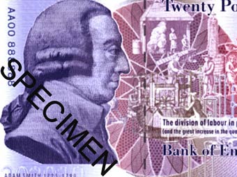 Банк Англии выпустил банкноту с изображением экономиста Адама СмитаНа новой 20-ти фунтовой банкноте, которую выпустил в обращение 13 марта Банк Англии, впервые изображен шотландец. Это экономист и философ Адам Смит, сообщает BBC News. На банкноте, которая сейчас находится в обращении, изображен британский композитор Эдвард Элгар. Эти купюры будут выведены из обращения в ближайшие месяцы. Новые деньги защищены от подделок широкой голографической полоской и нанесенным микрошрифтом. Стоит отметить, что изображение Адама Смита уже появлялось на 50-ти фунтовых шотландских банкнотах. Адам Смит получил известность после публикации в 1776 году книги "Исследование о природе и причинах богатства народов". В книгу были включены обсуждения таких концепций, как невмешательство правительства в торговлю, разделение труда, функции рынка и международное значение свободной экономики.![]() Банкнота с изображением Адама Смита. Фото с сайта Банка Англии LENTA.RU |