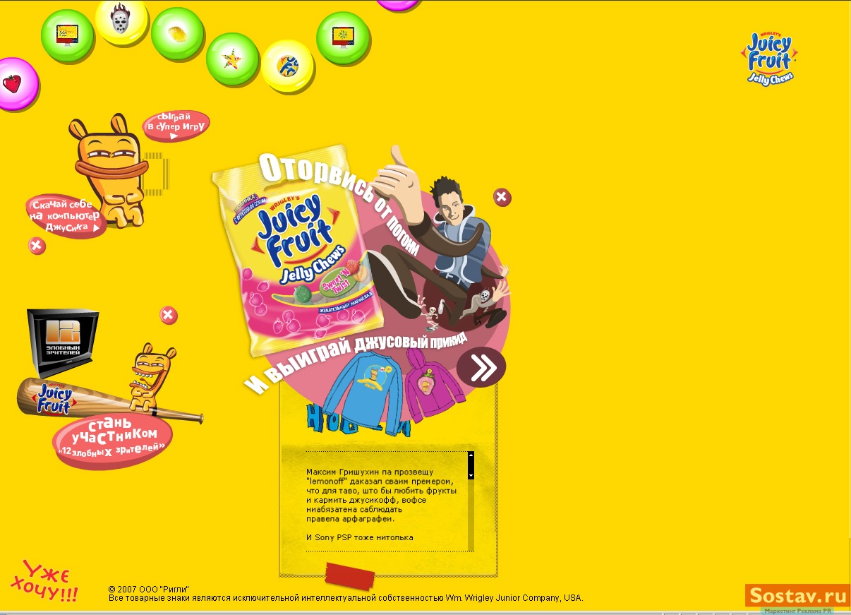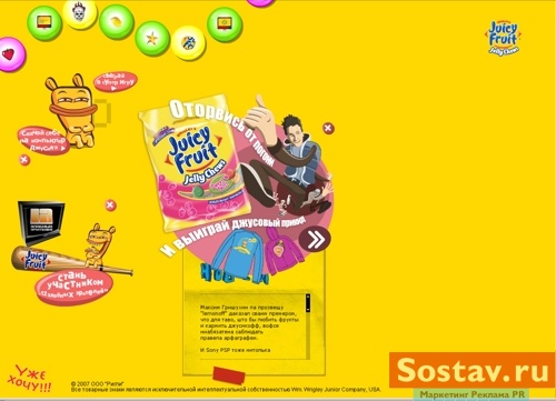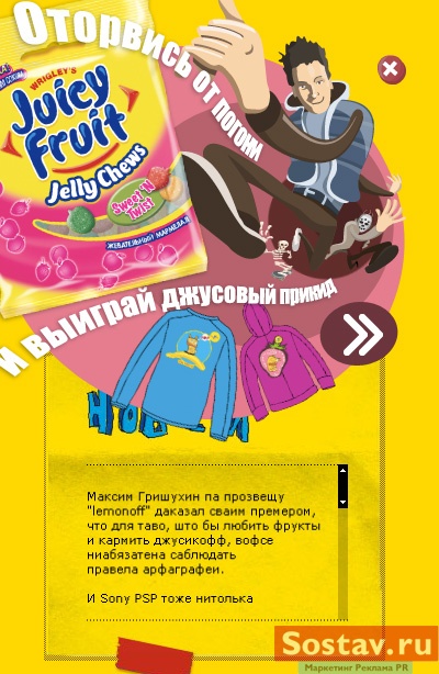 Переполох в подземке. Компания Wrigley запустила рекламу жевательного мармеладаНа федеральных каналах стартовала рекламная кампания бренда Juicy Fruit, принадлежащего компании Wrigley. Рекламные ролики вышли в эфир в начале марте. В подземке нешуточный переполох. Молодого человека из-за мармелада готовы буквально разорвать на части, чтобы заполучить пакетик с лакомством. Помимо прочего, из пустой головы появляется его точная копия с попыткой украсть сладости. Одновременно с рекламой на телевидении в рунете запустили сайт бренда Juicy Fruit, где желтое существо по имени Джусик, с большим ртом и вытянутым язык, издающее странные звуки, предлагает сыграть в супер-игру, а еще стать участником "12 злобных зрителей". Тут же на странице под картинкой виртуального молодого человека "Оторвись от погони и выиграй джусовый прикид", разместили новость об одном из победителей, который, судя по всему, "оторвался" на правилах русского языка: "Максим Гришухин даказал сваим пермером для таво, што бы любить фрукты и кармить джусикофф, вофсе ниабезательна саблюдать правела арфаграфеи".