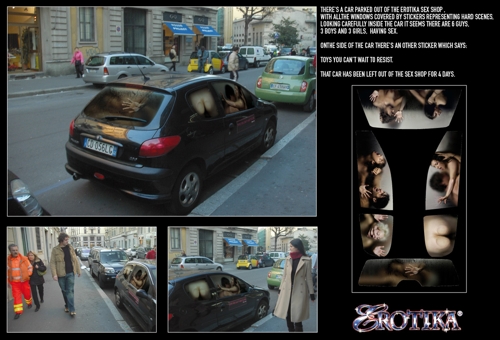 Секс-машина от агентства Leagas Delaney Italia для интим-магазина ErotikaИтальянское агентство Leagas Delaney Italia разработало оригинальную рекламную кампанию для интим магазина Erotika. На стекла машины, припаркованной у этого магазина, были помещены специальные стикеры, изображающие сцены эротического характера. У прохожих складывалось впечатление, что в машине шестеро людей занимаются сексом. Сбоку машины была размещена надпись: "Вы не можете ждать, чтобы попробовать эти игрушки. Эта машина стоит у интим магазина уже 4 дня." Агентство: Leagas Delaney Italia, Милан, Италия Творческий директор: Stefano Campora, Stefano Rosselli Арт директор: Andrea Cornacchia Копирайтер: Fabio Pedroni Фотограф: Yossi Loloy Старший менеджер: Francesco Poletti, Selmi Bali Barissever |