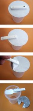 Известно, что крышка из фольги имеет слой термолака для приварки к пластиковому стаканчику. Исходя из этого, у изобретателя появилась идея при помощи этого же термолака под крышкой герметично закрепить «чистый» столовый прибор (ложечку, вилку, лопатку). Выступ ложечки через отверстие в крышке выходит наружу. К нему прикреплена рукоятка, которая может перемещаться в горизонтальной плоскости. В транспортном положении рукоятка находится над ложечкой и занимает мало места, а в рабочем - она превращается в рычаг для отрывания крышки. Обе детали ложечки могут быть изготовлены из пластика на обычном оборудовании. Фасовочный автомат для новой упаковки будет сложнее существующего. Однако эта проблема вполне разрешима. По словам изобретателя, одно из ведущих российских предприятий после изучения предложенной конструкции уже заявило, что может спроектировать и изготовить необходимое оборудование, если поступит соответствующий запрос. В небольшом видеофрагменте вы можете посмотреть процесс открывания стаканчика с новой крышкой и превращения крышки в ложку: