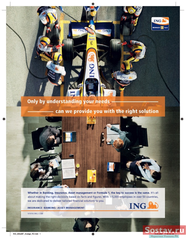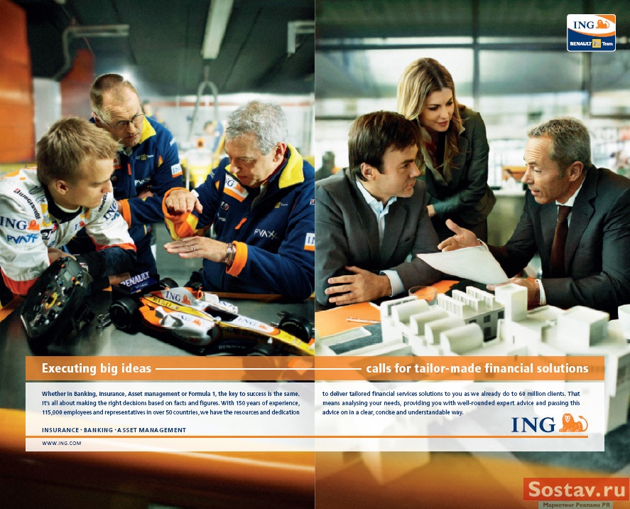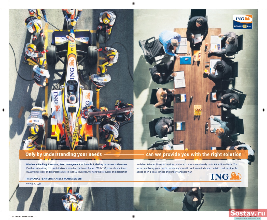 ING начинает глобальную рекламную кампанию в рамках спонсорства "Formula 1"15 марта стартует первая рекламная кампания в поддержку спонсорства команды ING Renault F1. Она приурочена к началу австралийского этапа "Formula 1" в Мельбурне и продлится вплоть до завершающего этапа гонки в Бразилии, то есть до 21 октября. Выступая титульным спонсором одной из сильнейших команд "Formula 1", финансовая группа ING вправе рассчитывать на дальнейший рост узнаваемости собственного бренда во всем мире, поскольку аудитория гонок охватывает более 850 млн человек различного возраста и социального статуса. Разработкой коммуникационной кампании для команды ING Renault F1 занималось немецкое агентство "Kempertrautmann". Кампания заключается в трансляции 15-40 секундных рекламных роликов в 30 странах мира на национальных и международных телеканалах во время всех этапов "Formula 1". Также предусматривается также поддержка в прессе, электронных СМИ, на новостных интернет-порталах и официальных сайтах "Formula 1". Основной акцент сделан на общих ценностях команды ING Renault F1 и ING Group, каковыми являются корпоративный дух, синхронизированное взаимодействие всех участников процесса, работа на победу и в спорте, и в бизнесе. Главной темой роликов является то, что и пилотов "Formula 1", и клиентов ING всегда поддерживает команда профессионалов. ING является одной из ведущих мировых финансовых групп, число клиентов которой превышает 60 млн. Компания предоставляет услуги в сфере банковского дела, страхования и управления активами в 50 странах. В 15 из 17 стран, в которых проводится гран-при "Formula 1", группа ING работает с усиленной активностью. В дополнение к титульному спонсорству команды ING Renault F1 группа ING участвует в брендинге 14 из 17 трэков "Formula 1". По словам Изабель М. Коннер, руководителя программы ING "Formula 1", сотрудничество с "Formula 1" является глобальной программой спонсорства, задача которой - усиление узнаваемости унифицированного бренда ING во всем мире. Сегодня "Formula 1" является самой лучшей платформой для глобального спонсорства, поскольку позволяет охватить широкую целевую аудиторию. |
