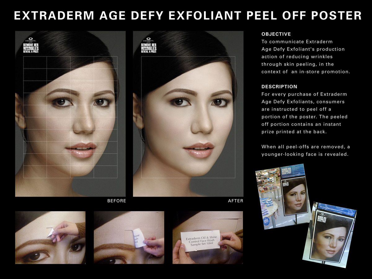 Агентство DM9 JaymeSyfu для рекламы косметики Extraderm заставило ЦА делать пилинг принтуАгентством DM9 JaymeSyfu была разработана необычная рекламная кампания для пилинга Extraderm Age Defy Exfoliant. В торговых центрах был размещен специальный постер с изображением молодой девушки. Посетителям предлагалось оторвать кусочек верхнего слоя, на оборотной стороне которого было написано, какой приз они выиграли. В качестве призов выступали пробники Extraderm. В итоге, когда весь верхний слой с плаката удален, лицо девушки выглядит посвежевшим, а морщинки пропадают. Надпись: "Удалите ее морщины, найдите приз" Агентство: DM9 JaymeSyfu Творческий директор: Eugene Demata, Merlee Jayme Арт директор: Herbert Hernandez Копирайтер: Jerry Hizon Дизайнер: Allan Montayre Фотограф: Toto Labrador Производство: Calypso |