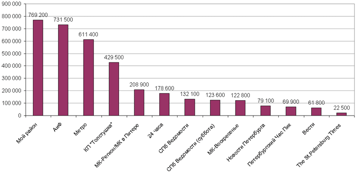 TNS Gallup Media - аудитория изданий ПетербургаTNS Gallup Media представил рейтинг новостных изданий Петербурга по аудитории одного номера за октябрь 2006 – февраль 2007 года. В тройку лидеров вошли сразу два бесплатных петербургских издания. Больше всего, в среднем 769 200 петербуржцев каждый месяц читали издания сети независимых газет «Мой район», третью позицию заняла также распространяющаяся бесплатно газета Metro (611 400 человек). Занять свое место в в тройке лидеров удалось также газете «Аргументы и факты» со средней аудиторией одного номера в 731 500 человек. Рейтинг новостных изданий Санкт-Петербурга по аудитории одного номера TNS Gallup Media (сентябрь 2006 – февраль 2007)![]() adlife.spb.ru |