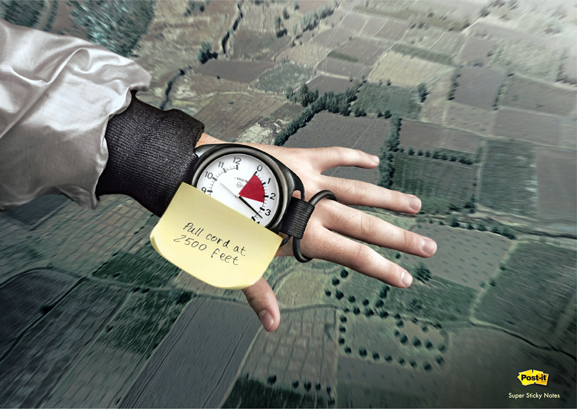 Агентство Grey Worldwide: прыгая с парашютом, не забудьте взять собой Post-itЗабыть можно все и всегда, но клеящиеся записочки Post-it выручат вас в любой ситуации. Агентство Grey Worldwide представляет вашему вниманию примеры таких случаев: парашютисту нельзя забывать, на какой высоте открывать парашют, а мотоциклист не помнит дорогу. Надпись: "Супер липкие записки" Агентство: Grey Worldwide Творческий директор: Mike Barnwell Арт директор: Mike Barnwell, Rob Prinsloo Копирайтер: Terry McKenna Фотограф: Mike Lewis |