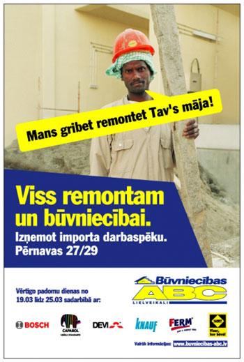 Министр по особым поручениям в делах общественной интеграции Оскар Кастенс назвал недопустимой рекламу магазинов стройматериалов Buvniecibas ABC, в которой темнокожий строитель на ломаном латышском и русском языке предлагает отремонтировать дом. Омбудсмен Роман Апситис призвал оштрафовать рекламодателя.