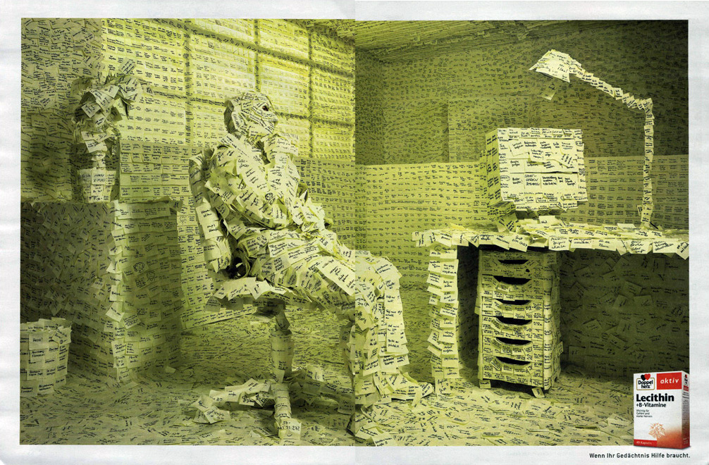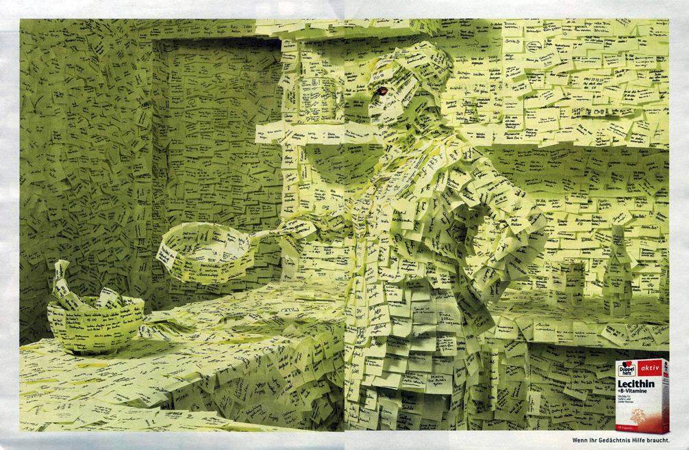 Рекламная кампания средства для улучшения памяти LecithinНет, это не реклама Post-it. Это реклама средства для улучшения памяти Lecithin. Создатели этих рекламных принтов считают, что без этого лекарства офисному работнику или домохозяйке может быть очень сложно удержать в голове всю информацию и рецепты. Надпись: "Когда твоей памяти нужна помощь." |