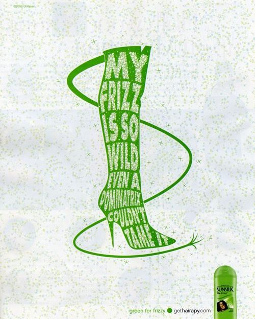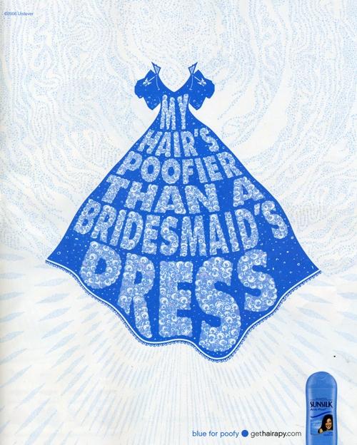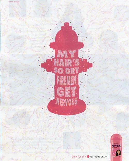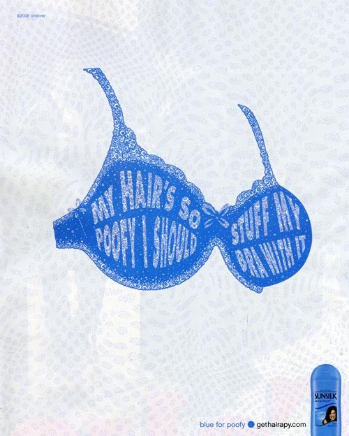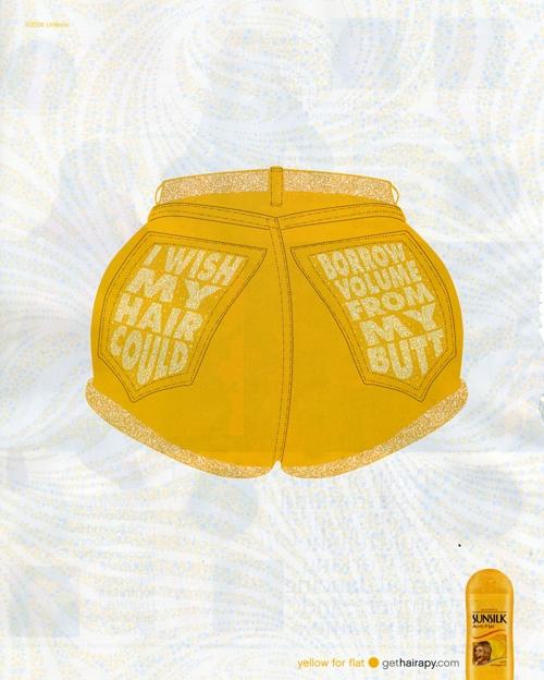 Шампуни Sunsilk для всех и каждогоПеред вами рекламная кампания шампуней Sunsilk. Преимущество линейки этих шампуней в том, что каждый может подобрать для себя наиболее подходящий. И тогда вам не придется мечтать о том, чтобы ваша попа поделилась объемом с прической. Надпись: "Мои волосы такие пышные, что могла бы наполнить ими свой лифчик. Голубой для пышных Мои кудри настолько дикие, что даже госпожа не могла бы приручить их. Зеленый для кудрявых Я бы хотела, чтобы мои волосы могли позаимствовать объем у моей попы. Желтый для прямых Мои волосы настолько сухие, что пожарники начинают волноваться. Розовый для сухих Мои волосы пышнее, чем платье у подружки невесты. gethairapy.com"