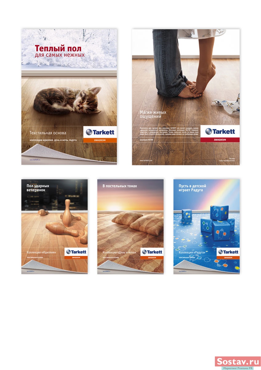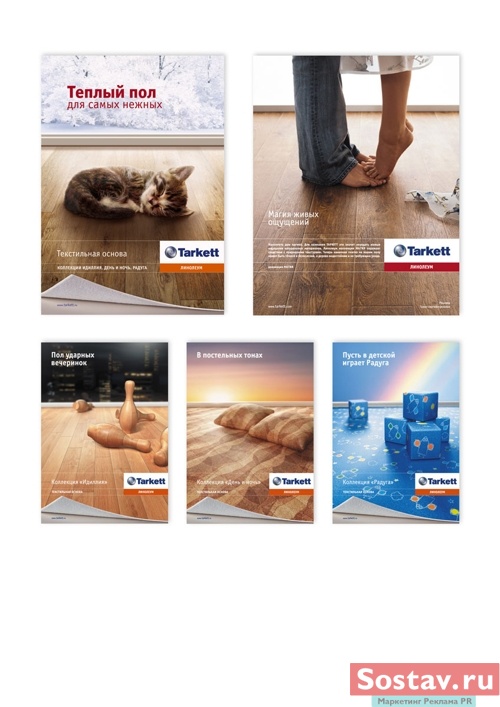 Брендингово-коммуникационое агентство Soldis разработало для компании Tarkett серию рекламных коммуникаций в рамках продвижения ее продукции на российском рынкеТранснациональная компания Tarkett специализируется на производстве напольных покрытий - ламината, паркета и линолеума. Целевая аудитория бренда Tarkett - женщины 26-36 лет. У них есть семья и дети, они успешны в работе, любят следить за собой и своим домом, большое внимание уделяют интерьеру жилья, делая выбор в пользу дизайна и удобства. Перед агентством Soldis стояла задача разработать визуальное и вербальное решение рекламных коммуникаций для продвижения бренда в одном из стратегически важных сегментов рынка - эластичных напольных покрытий. Разработанные рекламные материалы должны были информировать потребителя на местах продаж о новом продукте, коммуницируя уникальные свойства бренда. Исходя из поставленных задач, агентством были разработаны несколько креативных концепций, доносящие до потребителя соответствующие положения УТП бренда, расширившего свой ассортимент четырьмя коллекциями. Слоган "Магия живых ощущений" является вербализированным продолжением ключевого визуального образа для коллекции "Магия". Идея принтов передает уникальное свойство покрытий - абсолютную идентичность тактильных ощущений с природными текстурами дерева и камня. Спящий котенок, ставший ключевым элементом линии покрытий на текстильной основе, коммуницирует на визуальном уровне тепло и звукоизоляционные свойства продукта. Визуальный креатив и слоганы были разработаны для каждой коллекции, входящей в данную линию. "Пол ударных вечеринок" - коллекция сверхпрочного линолеума для гостиной и офиса "Идиллия". "Пусть в детской играет радуга" - коллекция для детской "Радуга". "В постельных тонах" - "День и ночь", покрытия для спальной комнаты. Разработанный агентством Soldis креатив дал основу для серии рекламных носителей в рамках продвижения новых коллекций. Состав творческой группы Креативный директор Ю.Миронов Арт-директор М.Ковалевская Дизайнер В. Бероев Копирайтер С.Некрасов Препресс подготовка - С.Большаков Эккаунт менеджер В.Обухова |