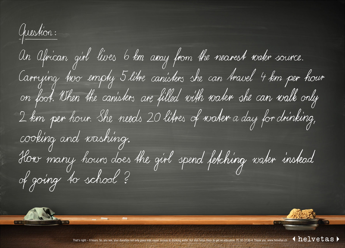Хорошо с математикой? Попробуйте решить задачку швейцарского Leo Burnett про африканскую девочкуМы все в школе решали несложные задачки по путешественников, которые куда-то ехали или шли. Агентство Spillmann/Felser/Leo Burnett, разработавшее данный принт для общественной организации Helvetas, предлагает вашему вниманию задачку такого же типа. В ней вам предлагается подсчитать, сколько времени африканская девочка затрачивает на добывание воды каждый день. "Вопрос: Африканская девочка живет за 6 км от ближайшего источника воды. Неся две пустые пятилитровые канистры, она идет со скоростью 4 км/час. Когда канистры наполнены водой, она идет со скоростью всего лишь 2 км/час. Ей нужно 20 литров воды в день для питья, мытья и готовки. Сколько часов девочка потратит, нося воду, вместо того, чтобы ходить в школу. 9 часов. Так что, как вы видите, ваши пожертвования помогают детям получить не только воду, но и образование" Состав творческой группы Агентство: Spillmann/Felser/Leo Burnett, Швейцария Творческий директор: Martin Spillmann Копирайтер: Stefan Ehrler Арт директор: Patrik Rohner Фотограф: Jonathan Heyer |