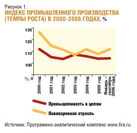 В течение 2000–2002 годов пивоваренное производство росло особенно быстрыми темпами. В течение 2003–2005 годов темпы роста замедлились, и по итогам 2005 года пивная отрасль по росту производства немного превосходила общепромышленный уровень. А вот в январе–сентябре 2006 года российское пивоваренное производство вновь демонстрирует темпы роста, значительно опережающие суммарный показатель по всем отраслям (рис. 1).