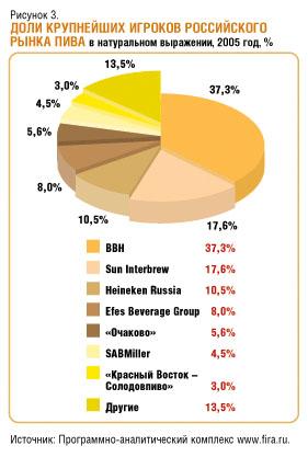Анализ изменения доли крупнейших производителей пивоваренной продукции показывает, что за период 2000–2005 годов наибольший рост доли в общероссийском объеме принадлежит концерну BBH – на 12,2 п.п. Значительно меньше росли доли концернов Efes и Sun Interbrew – на 5,4 и 3,4 п.п. соответственно.