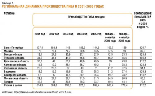 Анализ производства по субъектам Российской Федерации показывает постепенное снижение доли Санкт-Петербурга и Москвы в общем выпуске. Так, по итогам 9 месяцев 2006 года доля северной столицы в общероссийском производстве составила 18%, тогда как в период 2000–2002 годов она находилась на уровне 21-22%. Москва в январе–сентябре 2006 года обеспечила 7,6% производства российского пива, что также значительно ниже, чем в 2000 году, когда в столице было произведено 17,3% всего российского пива. В то же время доля, например, Омской области возросла с 3% в 2001 году до 6,9% по итогам января-сентября 2006-го.
