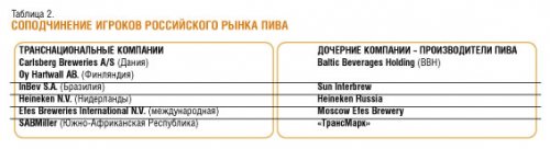 Для пивоваренной отрасли характерен высокий уровень глобализации. Современное развитие в условиях свободного рынка сделали российский рынок пива одним из самых успешных в стране и крайне привлекательным для международного капитала. В настоящее время контрольные пакеты крупнейших российских пивоваренных компаний принадлежат иностранным владельцам (табл. 2).