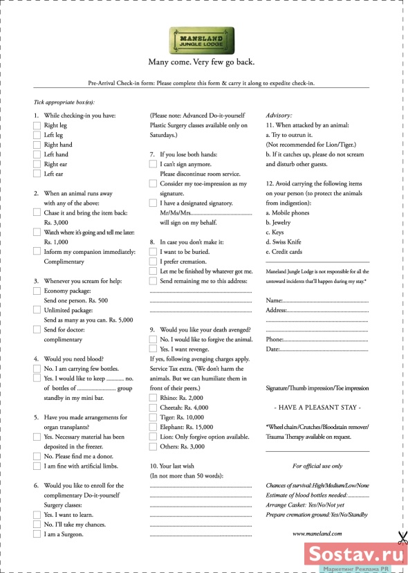 Leo Burnett Мубай приглашает посетит "Домик в джунглях"Рекламное агентство Leo Burnett India, входящее в глобальную сеть Leo Burnett Worldwide, создало кампанию для туристического комплекса Maneland Jungle Lodge. На постерах изображены служащие "Домика в джунглях", расположенного в глухом индийском лесу. А для того чтобы туристы составили полное представление о предстоящем отдыхе, предлагается ответить на вопросы "Бланка регистрации": "Ваше последнее желание" или "Хотите ли вы, чтобы за вашу смерть отомстили?". Состав творческой группы Постеры: "Повар", "Официант", "Ресепшн", "Бюро находок", "Бланк регистрации" Медиа категория: принт Медиа суб-категория: газета Клиент: Maneland Jungle Lodge Бренд: Maneland Jungle Lodge Состав творческой группы Агентство: Leo Burnett (Мумбай) Страна: Индия Креативный директор: Santosh Padhi Исполнительный креативный директор: Kv Sridhar Эккаунт-директор: Sandeep Pathak Арт-директор: Santosh Padhi / Kunal Mhabadi Копирайтер: Santosh Padhi |
