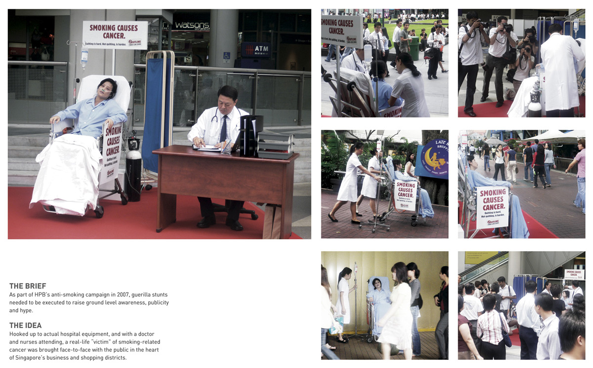 Онкологические больные ездят по улицам Сингапура для пропаганды борьбы с курениемАгентство DDB Worldwide разработало оригинальную рекламную акцию, направленную против курения. В центральных торговых и бизнес районах Сингапура было размещено медицинское оборудование с доктором, медсестрами, а также больной раком. Таким образом, столкнувшись с этим лицом к лицу, горожане просто не могли не обратить внимание на эту проблему. Надпись: "Курение вызывает рак" Агентство: DDB Worldwide, Сингарпур Творческий директор: Terrence Tan Арт директор: Khoo Meng Hau, Sin Копирайтер: Daniel Ko, Jimmy Yar Менеджер по работе с клиентами: Jimmy Yar, Adeline Chang, Stella Pok |