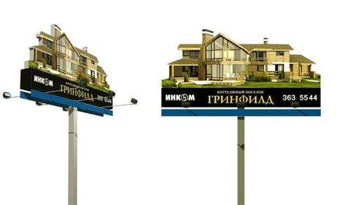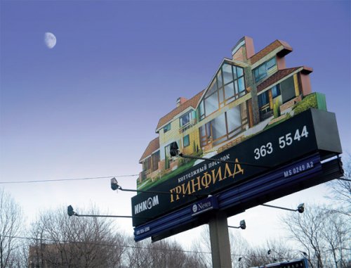 Парящий коттедж из суперсайтаВесь прошлый год корпорация «ИНКОМ-Недвижимость» активно рекламировала свой элитный коттеджный поселок «Гринфилд». Сначала появились щиты на подмосковных трассах, ближе к осени – перетяжки на столичных улицах. Завершающим аккордом кампании стала оригинальная объемная конструкция в виде дома.