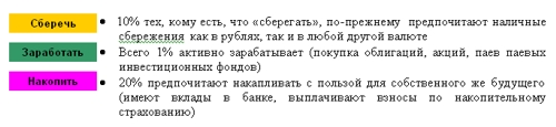 Английские коллеги по исследованиям удивляются, почему репрезентативность исследования TGI - Russia не все население России, а именно 62,5 миллиона человек. Немного сложно было им объяснять, что сельское население, которое составляет около 25%, просто недоступно для интервьюеров - не доехать по ухабам нашим бескрайним. А что касается финансовых исследований, так в селах нет даже элементарного доступа к банковским и страховым услугам в силу географических и экономических причин. Тем более, налицо явная тенденция сокращения сельского населения, вызванная, в первую очередь, трудовой миграцией. Вдобавок к всероссийской проблеме малого проникновения финансовых услуг отметим также недостаточную финансовую грамотность населения. Это отчасти связано с явлением под названием "Сберкасса" (с другой стороны, назовите хоть один банк с такой филиальной системой! - прим.ред.). По-прежнему велико недоверие людей к активной инвестиционной деятельности, хотя ситуация на сегодняшнем финансовом рынке выглядит заметно лучше чем раньше.