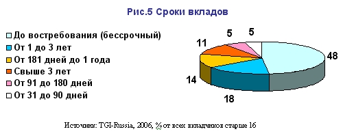 Несмотря на невысокую доходность вкладов, 20% населения по-прежнему предпочитают этот вид вложений средств. Причем около 95% - рублевые вклады, около 8% - долларовые и 3% всех вкладов - в евро. Самый востребованный вид вклада - бессрочный. На него приходится около 48% всех вкладов, за ним следуют вклады сроком от 1 до 3-х лет (рис.5).