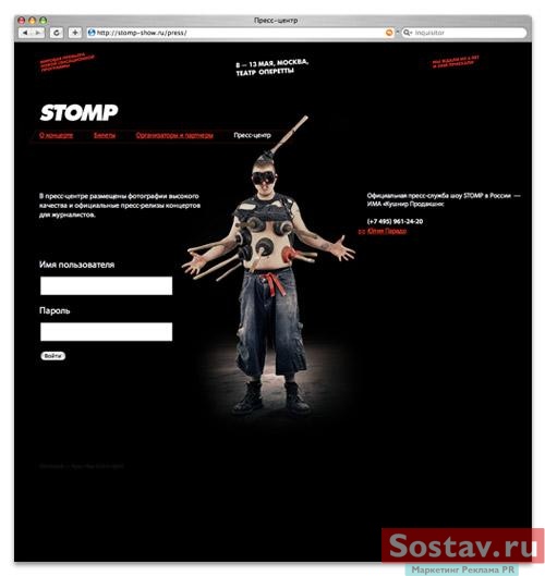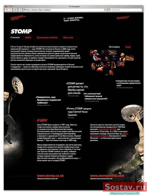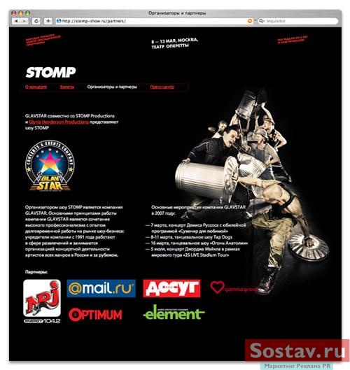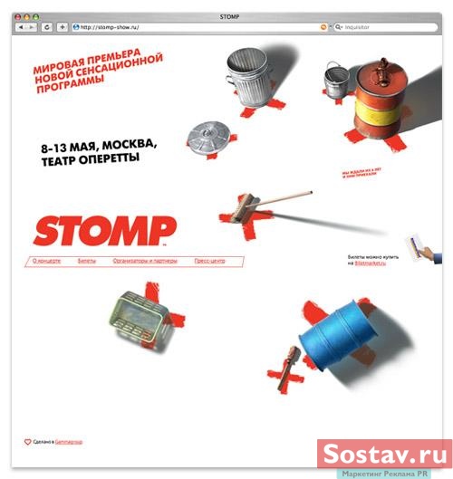 Агентство позитивных коммуникаций Gammagroup разработало промо-сайт для шоу STOMPКомпания Gammagroup разработала промо-сайт в поддержку московского выступления уникального шоу STOMP. Именно в Москве состоится мировая премьера новой сенсационной программы, репетиции которой шли весь прошлый год в Лондоне. Настоящий промо-сайт - первый подобный в сфере музыкальной индустрии России. Благодаря оригинальным возможностям данный сайт являет собой новый уровень подачи информации: он насыщен звуками, визуальными образами и содержит массу полезного и интересного контента. Т.е. в отличие от прочих промо-сайтов, призванных продавать только билеты и только посредством размещения активных баннеров, промо-сайт шоу STOMP - это информация, развлечение и, конечно, увеличение продаж. На сайте можно подробнее узнать о представлении (его жанр определяется как ритм-шум-шоу), посмотреть видео и фотографии выступления артистов, почитать восторженные отзывы зрителей и приобрести билеты. Среди прочего, каждый может почувствовать себя настоящим музыкантом, участником данного шоу: для этого в дизайне сайта использован целый арсенал мусорных баков, швабр, вёдер, бочек, ящиков и прочих "музыкальных инструментов". Состав творческой группы Креативный директор: Петр Харитонов Арт-директор: Игорь Киселев Дизайнер: Ваня Павличенко Технический дизайнер: Макс Бердников Технический директор: Олег Мухутдинов Флеш-технолог: Сергей Лазарев Технолог: Вова Борзыкин ![]() ![]() ![]() ![]() |