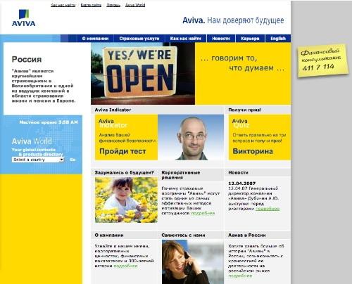Британский страховщик Aviva, придя в Россию, использует для своего продвижения Интернет. Яркие желтые баннеры с фрагментами голов размещены, например, на онлайновых изданиях Лента.ру и Газета.ру