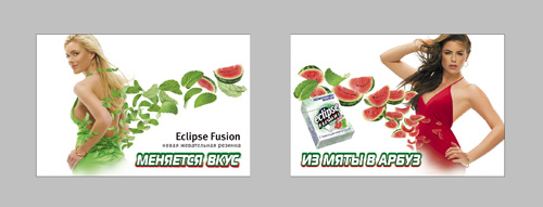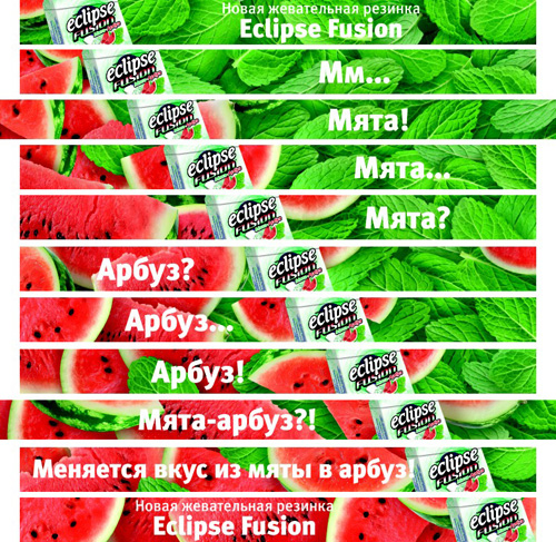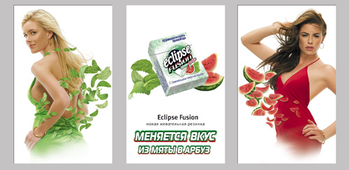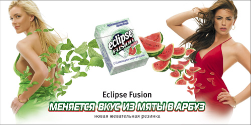 Eclipse Fusion - вкусы меняютсяРекламное агентство BBDO Moscow и Wrigley Russia запустили интегрированную рекламную кампанию в поддержку вывода на рынок инновационной жевательной резинки Eclipse Fusion. В рамках кампании используется телевизионная и радио поддержки, размещение ролика в кинотеатрах, визуальная кампания на наружных носителях (билборды, сити форматы, метро постеры и метро стикеры, лайт боксы в кинотеатрах), интернет страница, а также sampling кампания. Кампания стартует с апреля 2007 года