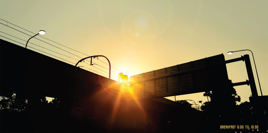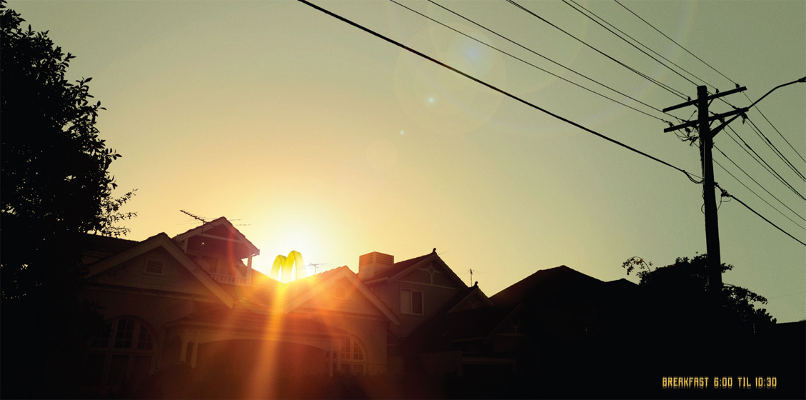 И встает над городом McDonald's…Перед вами рекламная кампания австралийского McDonald's, созданная агентством DDB. На принтах мы видим рассвет в городе, но есть одно но: вместо солнца над городом поднимается символ McDonald's - большая желтая буква "М". Видимо, до нас пытались донести, что день должен начинаться с завтрака в этих закусочных. Надпись: "Завтрак с 6:00 до 10:30" Состав творческой группы Агентство: DDB, Австалия Исполнительный творческий директор: Matt Eastwood Помощник творческого директора: Steve Back Креатив: Ant&Alex Фотограф: Mat Baker Ретушер: Dennis Monk Типография: Jason Young Персональный менеджер: Michael Godwin |