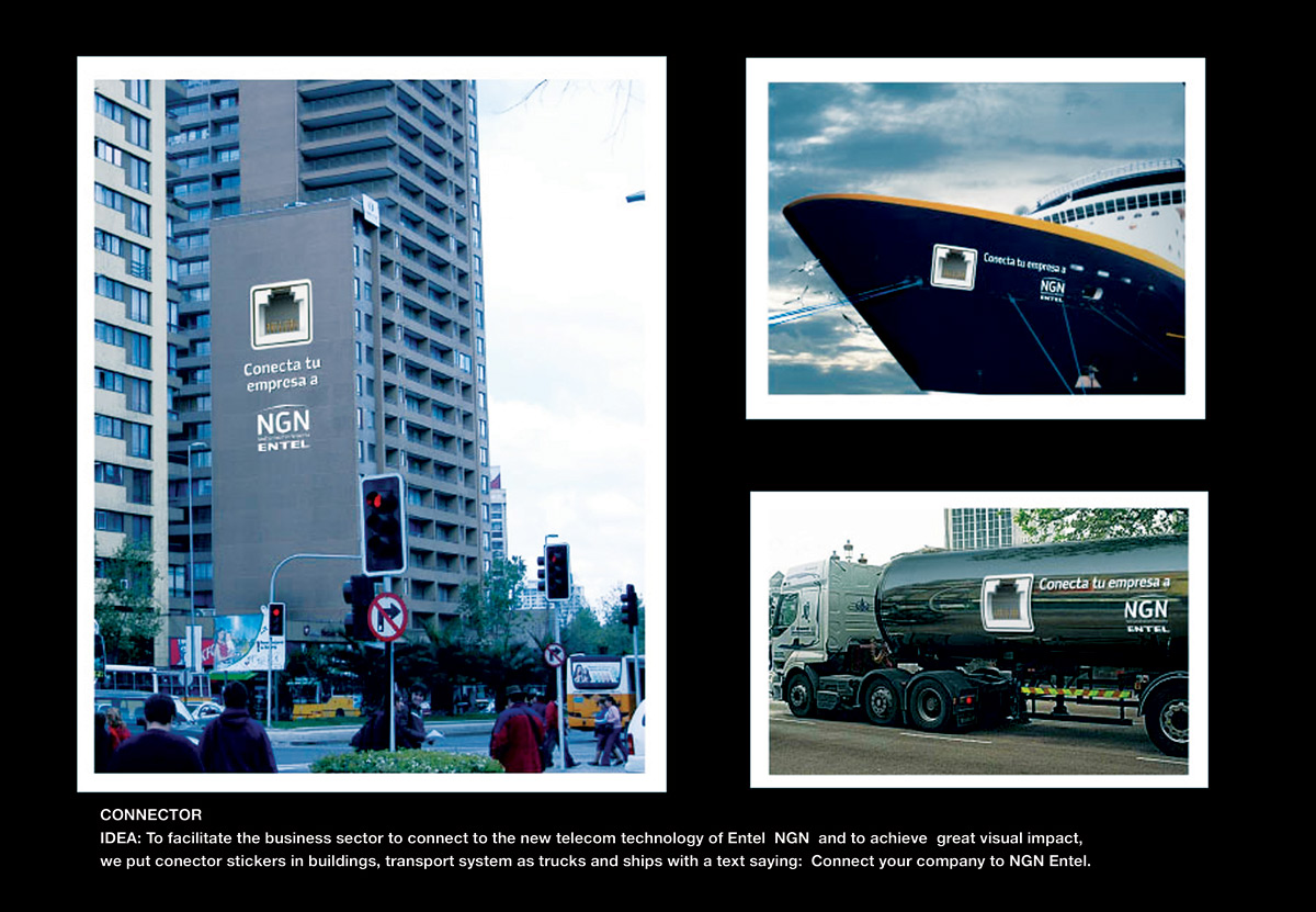 Агентство Leo Burnett Chili подключает здания к Entel NGNЭто рекламная кампания нового телекоммуникационного сервиса Entel NGN, созданная чилийским агентством Leo Burnett. Для того чтобы привлечь внимание к этому новому продукту, на зданиях, грузовиках и даже на кораблях были размещены стикеры, изображающие огромный коннектор. Надпись: "Подключи свою компанию к NGN Entel." Агентство: Leo Burnett, Чили Творческий директор: Hector Orellana Арт директор: Claudio Ruiz, Gabriel Cantallopts Копирайтер: Gonzalo Vega Фотограф: Guillermo Galvez |