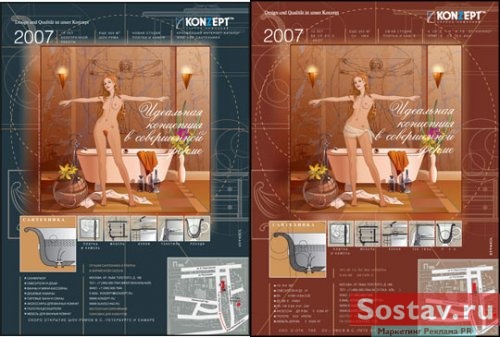 Рекламное агентство "Symbol Communication Group" - красота и гармония произведений Леонардо да Винчи в современных ванныхРекламное агентство "Symbol Communication Group" разработало макеты в для рекламы прессе для компании "Konzept" - ведущего ритейлера в области дорогих решений для кухни и ванной комнаты. В основе творческой концепции - тема совершенного человека в совершенном окружении. Идею обратиться к трудам Леонардо да Винчи и раскрыть образ с помощью "Витрувианского человека" предложил заказчик. ![]() |