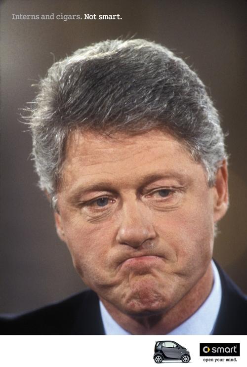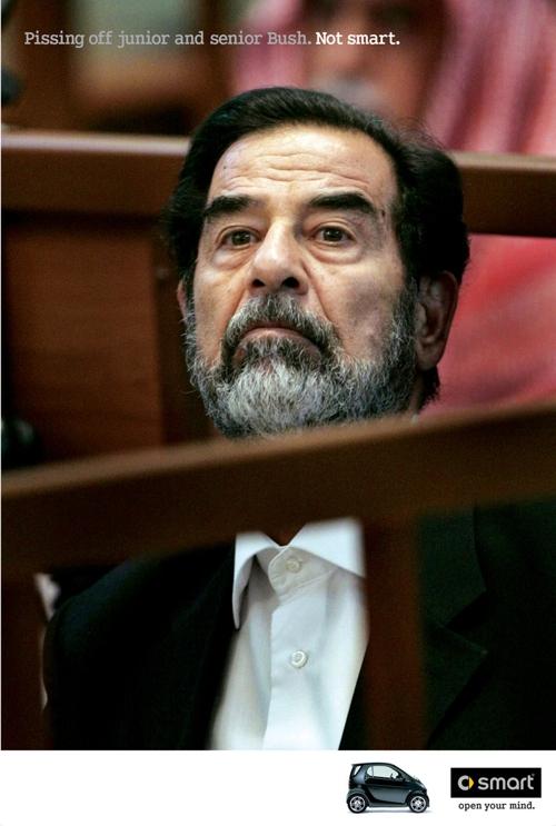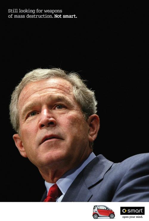 Агентство Crush, Малайзия, использует политиков в рекламе автомобиля SmartВ английском языке есть несколько значений слова "smart". Его можно перевести и как "красивый", и как "умный". В данном случае агентство Crush считает, что люди, покупающие "красивый" автомобиль Smart, поступают "умно", а вот такие известные люди, как Буш, Клинтон или Садам поступают "не умно" Надпись: "Буш: До сих пор ищет оружие массового поражения. Садам: Бесит младшего и старшего Бушей. Клинтон: Практикантки и сигары. Не умно. Smart. Раскрой свой разум." Агентство: Crush, Петалинг-Джая, Малайзия Творческий директор: Kenneth Lim Арт директор: Adrian Tan/Danny Thong Копирайтер: Kenneth Lim Фотограф: Corbis