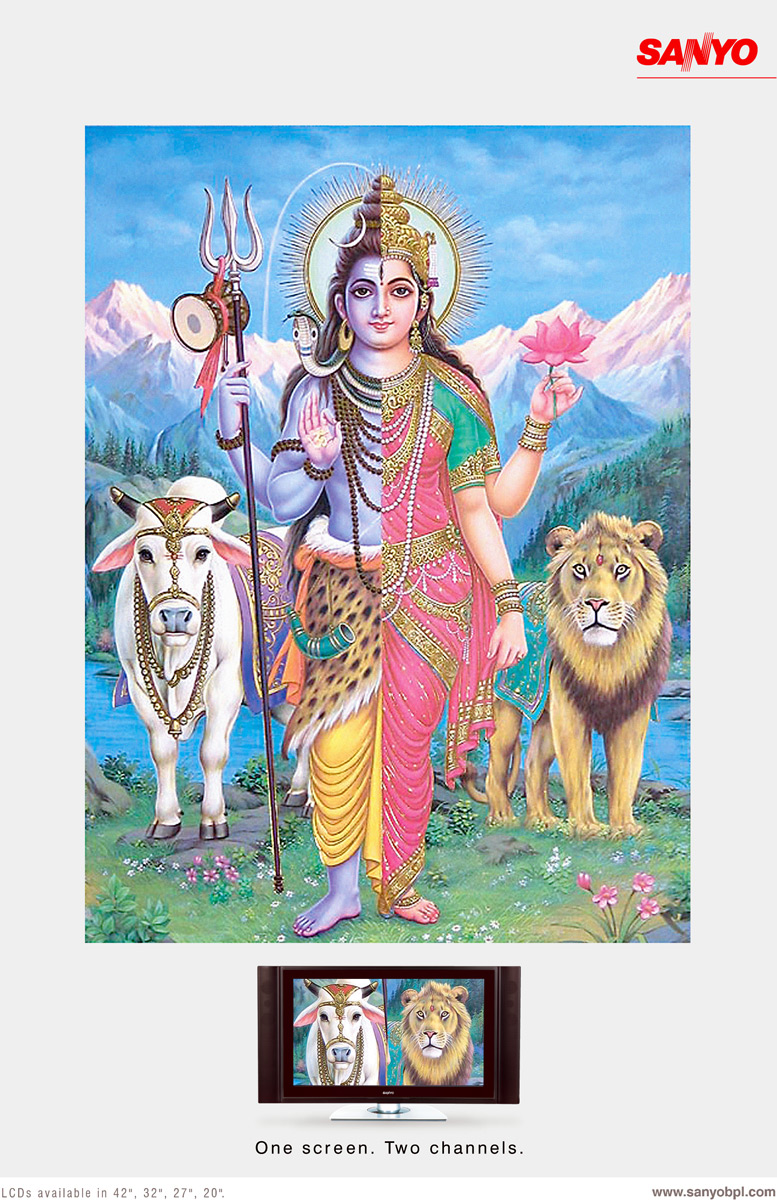 Агентство Triton Communications India привлекло индийских богов к рекламе ЖК-телевизоров SanyoПеред вами региональная рекламная кампания, созданная бангалорским агентством Triton Communications для рекламы ЖК-телевизоров Sanyo на индийском рынке. На плакате изображено индийское божество, представляющее собой мужчину и женщину в одном теле. А надпись на плакате гласит: "Один экран. Два канала". Агентство: Triton Communications, Бангалор, Индия Творческий директор / Копирайтер: Satya P Ranjan Арт директор: Bhupen Gosai |