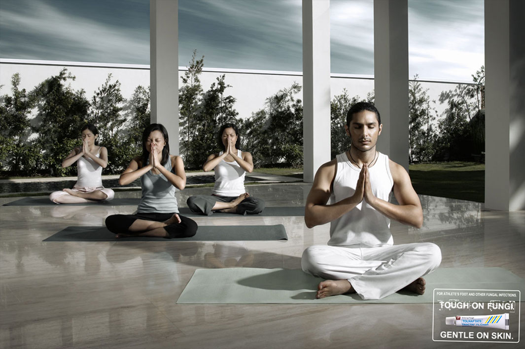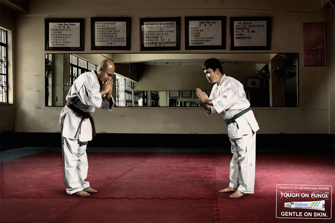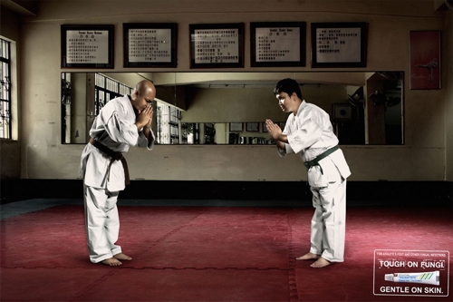 Реклама крема против грибковых заболеваний Tolnaftate от агентства DM9 JaymeSyfuВаши ноги плохо пахнут из-за грибковых инфекций? И все вокруг чувствуют это, когда вам приходится снимать обувь при других людях, например, на курсах карате или занятиях йогой? Агентство DM9 JaymeSyfu предлагает вашему вниманию крем Tolnaftate, которой решит все ваши проблемы, связанные с грибком на ногах. Надпись: "От микоза и других грибковых инфекций. Жесткий для грибков. Нежный для кожи." Агентство: DM9 JaymeSyfu |