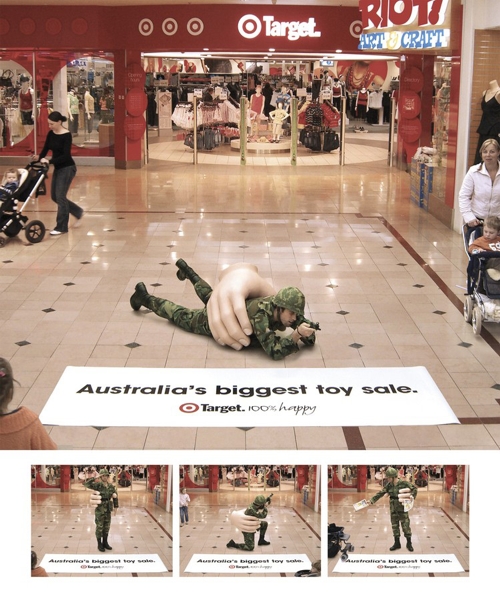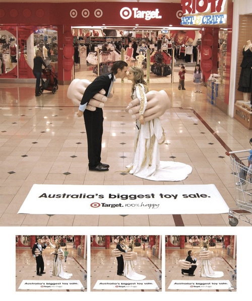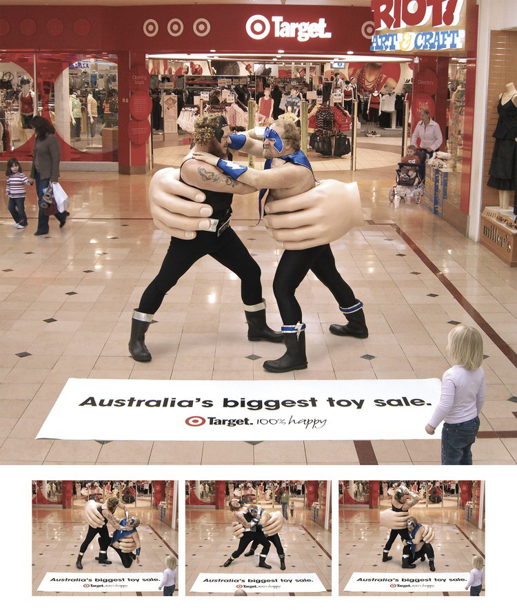 Люди-игрушки в рекламной кампании магазина Target от агентства The Campaign Palace АвстралияЧтобы прорекламировать Распродажу Самых Больших Игрушек Австралии в магазине Target, агентство The Campaign Palace разработало оригинальную кампанию: актеров одели словно кукол, а сзади к их костюмам были прикреплены огромные руки так, что, когда они двигались, создавалось впечатление, будто с ними играют. Агентство: The Campaign Palace, Мельбурн, Австралия |