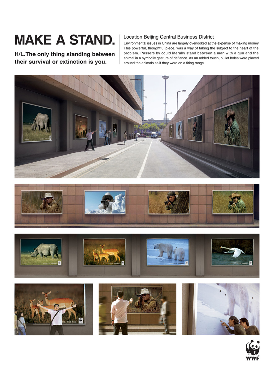 Агентство Ogilvy & Mather Advertising и WWF заставило прохожих становиться по пулиКак объяснить людям, что жизнь или смерть животных зависит только от людей? Китайское агентство Ogilvy & Mather Advertising и общественная организация WWF попробовали сделать это с помощью этой социальной кампании под названием "Остановись". Эти щиты были размещены в центральном бизнес районе Пекина, а, проходя мимо них, создавалось впечатление, что вы встали на пути пули охотника. Надпись: "Единственная вещь, стоящая между их выживанием или исчезновением - это Вы." Агентство: Ogilvy & Mather Advertising, Пекин, Китай Творческий директор: Nils Andersson, Jacky Lung Арт директор: Xingsheng Qi, Shengxiong Chen Копирайтер: Zhong Yuan Фотограф: Huimin Li |
