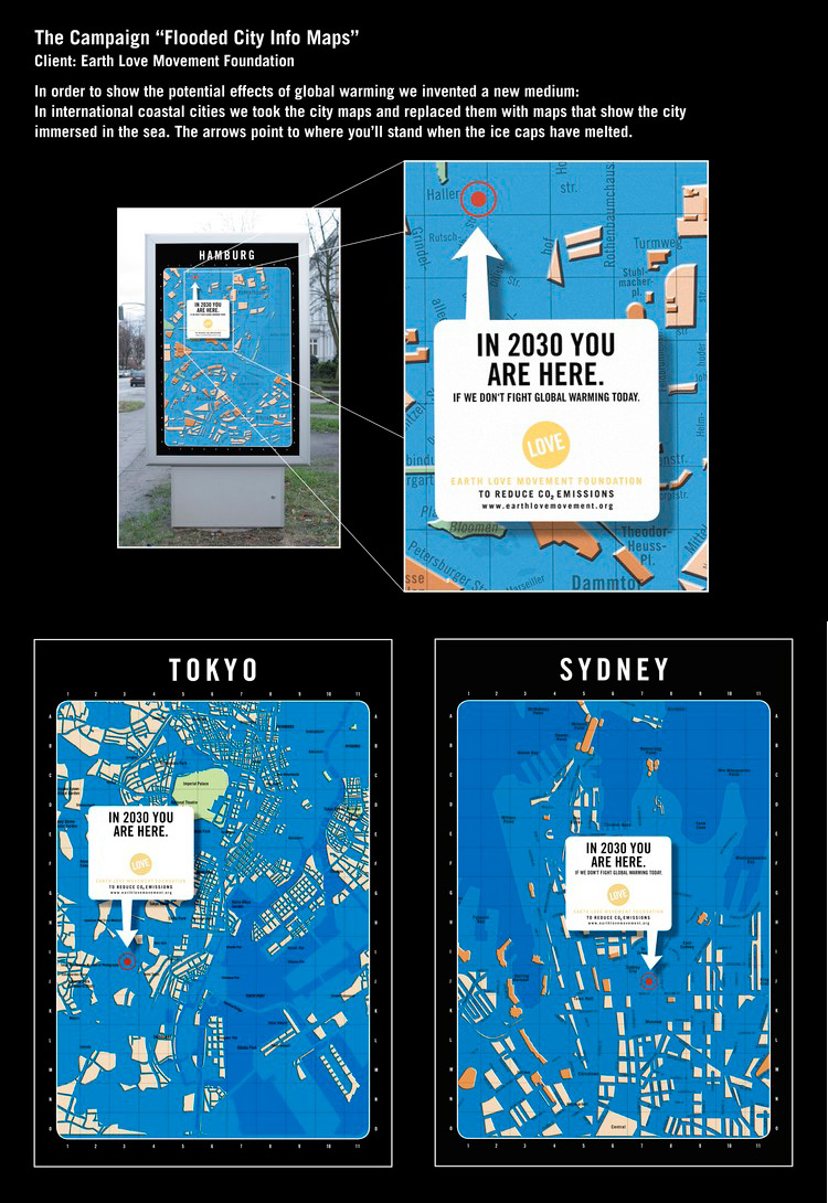 Социалка от агентства Jung von Matt для Earth Love Movement FoundationКак заставить людей обратить внимание на проблему глобального потепления? Агентство Jung von Matt, создавшее эту рекламную кампанию для ассоциации Earth Love Movement Foundation, избрало оригинальный путь. На городских улицах обычные карты заменили картами, на которых представлен план города, залитого водой. Красная точка обозначала местоположение щита. Надпись: В 2030 вы стоите здесь. Если мы не будем сражаться с глобальным потеплением сегодня. Поддержи Earth Love Movement Foundation, чтобы сократить выброс CO2." Агентство: Jung von Matt, Гамбург, Германия Творческий директор: Jan Rexhausen, Doerte Spengler-Ahrens Арт директор: Stefanie Huber Копирайтер: Henning Mueller-Dannhausen Аккаунт-менеджер: Jasmin Bedir, Biljana Retzlik, Friederike Dous |