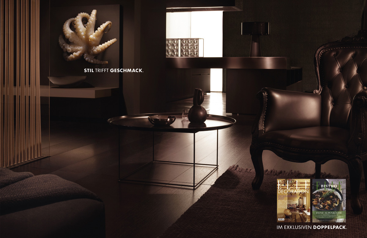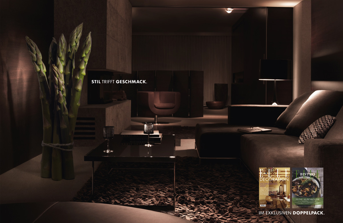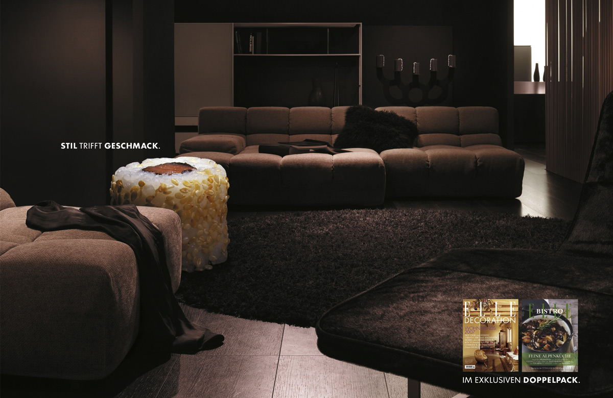 Еда и декор в рекламе ELLE Decoration и ELLE Bistro от агентства GBK, HeyeЕда и декор очень хорошо сочетается, считает немецкое агентство GBK, Heye, создавшее эту рекламную кампанию для журналов ELLE Decoration и ELLE Bistro. Дело в том, журнал ELLE проводит акцию - два журнала будут продаваться в одной упаковке. Ну а агентство GBK, Heye совмещает на принтах темы обоих этих журналов. Надпись: "Стиль встречается со вкусом. ELLE Decoration и ELLE Bistro, эксклюзивная двойная упаковка." Агентство: GBK, Heye, Мюнхен, Германия Творческий директор: Alexander Bartel, Martin Kiessling Арт директор: Zeljko Pezely, Amalija Tidlacka Копирайтер: Gunther Marschall, Marcel Koop Фотограф: Kristian Rahtjen Стиль: Sabina Grimm |